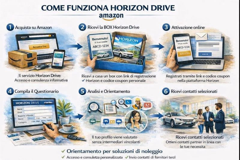 Il servizio di noleggio, se attivato, è fornito esclusivamente da fornitori terzi indipendenti. Horizon Drive non effettua prenotazioni né intermedia contratti.