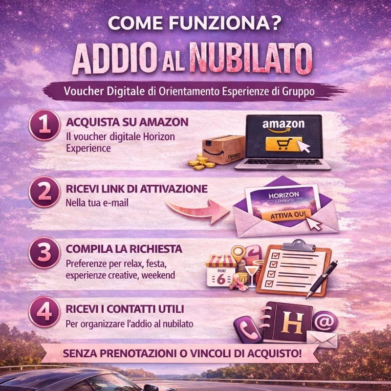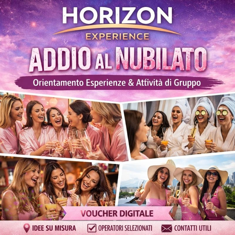 Horizon Experience – Addio al Nubilato è un voucher digitale di orientamento pensato per aiutare gruppi di amiche a organizzare un addio al nubilato su misura, in base a zona, data, budget e stile dell’esperienza.